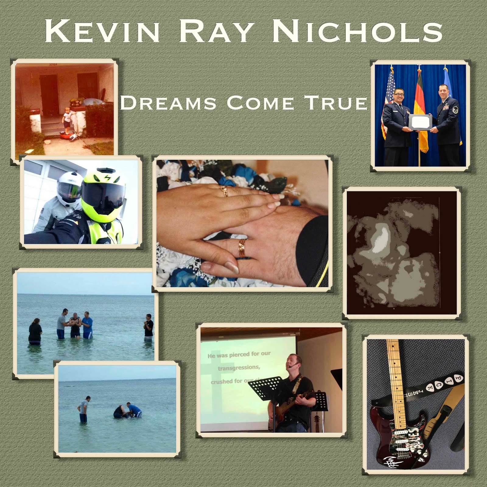 "My debut album, "Dreams Come True," tells a musical journey from top to bottom; from my “beginnings” writing music with my brother, seeing “Dreams Come True” in my gracious marriage to my wife and seeing the miracle of birth in my daughters, to being “Restored” by God and being “Baptized” in the East China Sea in 2007 during my Air Force tour to Japan. I now look toward the future in my still "new" life with Jesus Christ, when one day the “Train Goin’ Home” will carry me through the "Rapture" on my way to Heaven. I pray that it inspires you and brings you closer to living your life for the one true God."